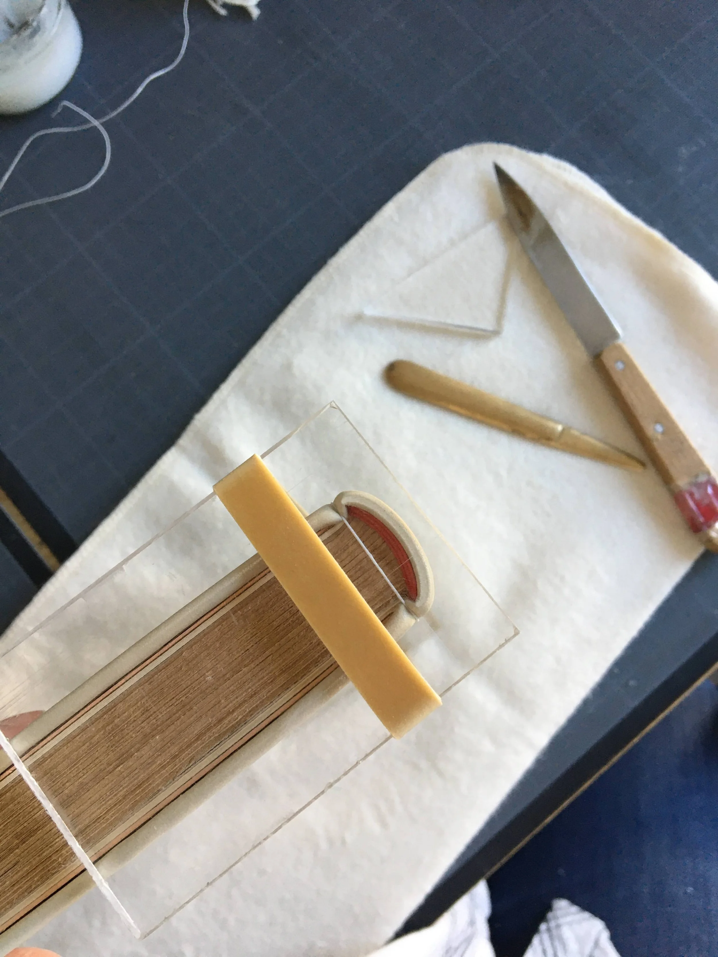 Dans le respect du livre, j’utilise des matériaux neutres et des fibres naturelles pour tous les contacts directs. En 2025, j’élimine la colle plastique de l’atelier et je n’utilise plus que des colles réversibles et neutres.