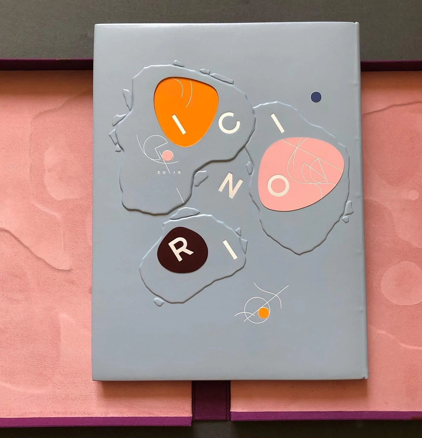 Pour reprendre le thème naturel vs artificiel dans mon travail de reliure, j’ai proposé un ensemble de signes sur 3 niveaux de lecture. Inspirée par la cartographie et le dessin scientifique, cet ensemble évoque une transition de la matière brute à la matière artificielle. Ainsi cohabitent sur la reliure des volumes aux formes libres avec des ovoïdes et des dessins inspiré de la géométrie.