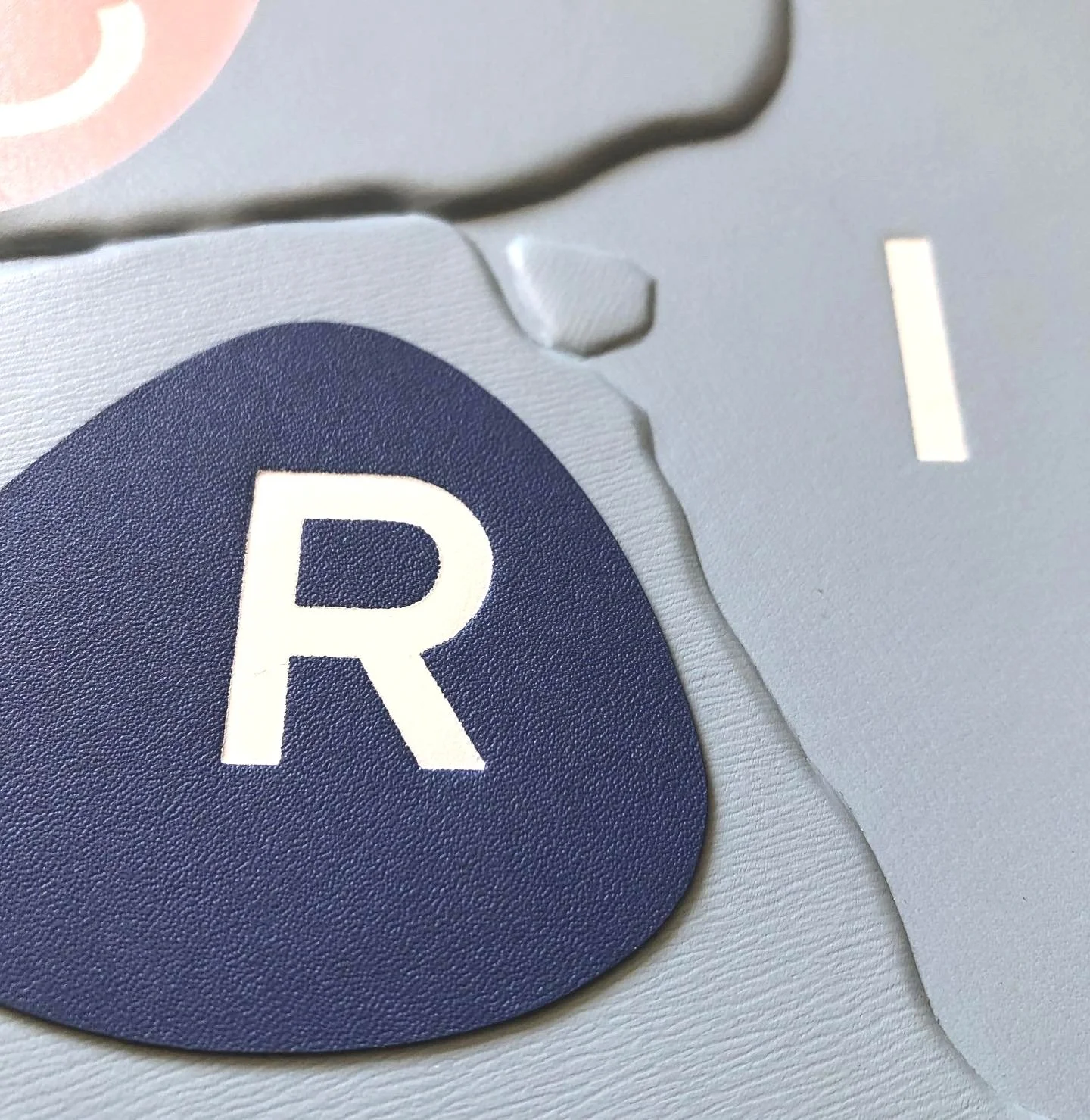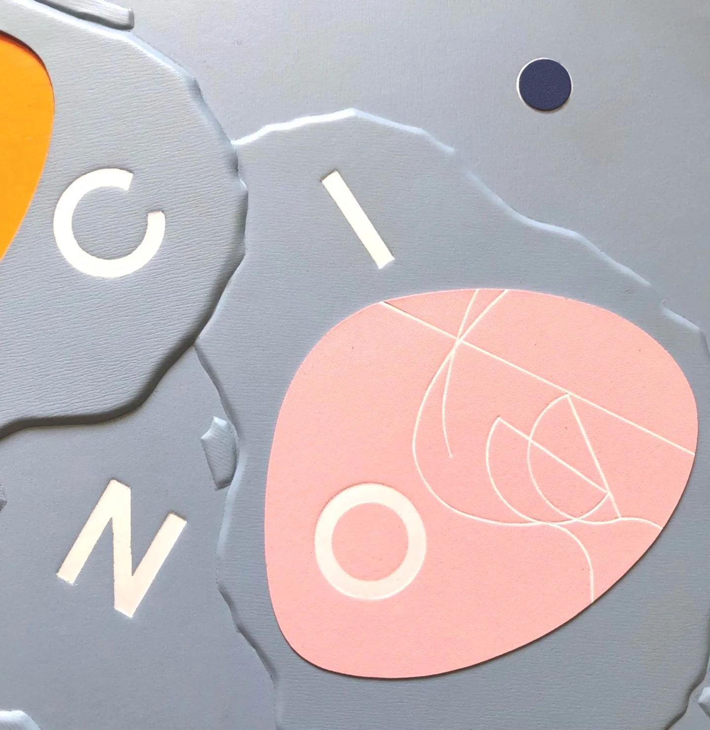 Les tracés géométriques, représentant l’artificiel, sont réalisés en dorure manuelle avec des filets marqués au film Oeser blanc. L’ensemble des lettrages, qui sont pour moi la plus grande marque de sophistication, sont également réalisés à la dorure manuelle au film blanc. L’ordre y est supposé par une composition rigide selon une grille de construction, tandis que le désordre s’y installe avec des lettres qui s’affranchissent de leur ligne de base (la ligne de pied en typographie).