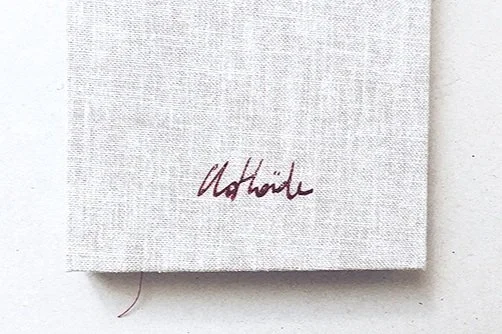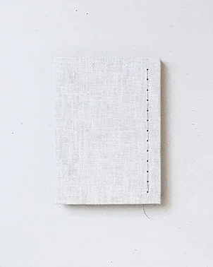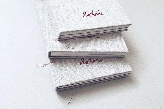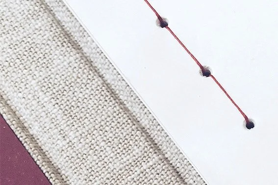 Réalisé en 2015, façonnage d'une série de livres couverts en toile registre. Montage des feuillets plié coté gouttière, couture à la japonaise sur fil rouge sur le plat arrière.