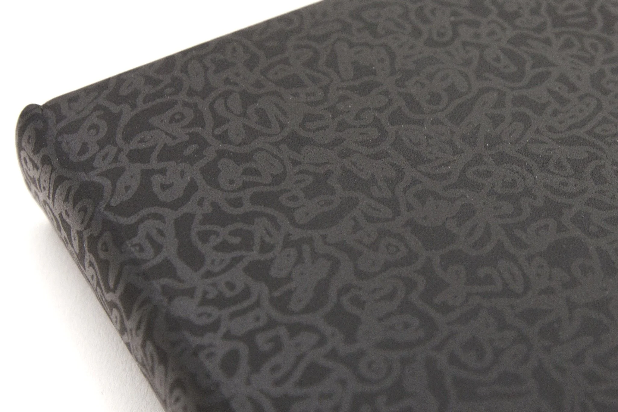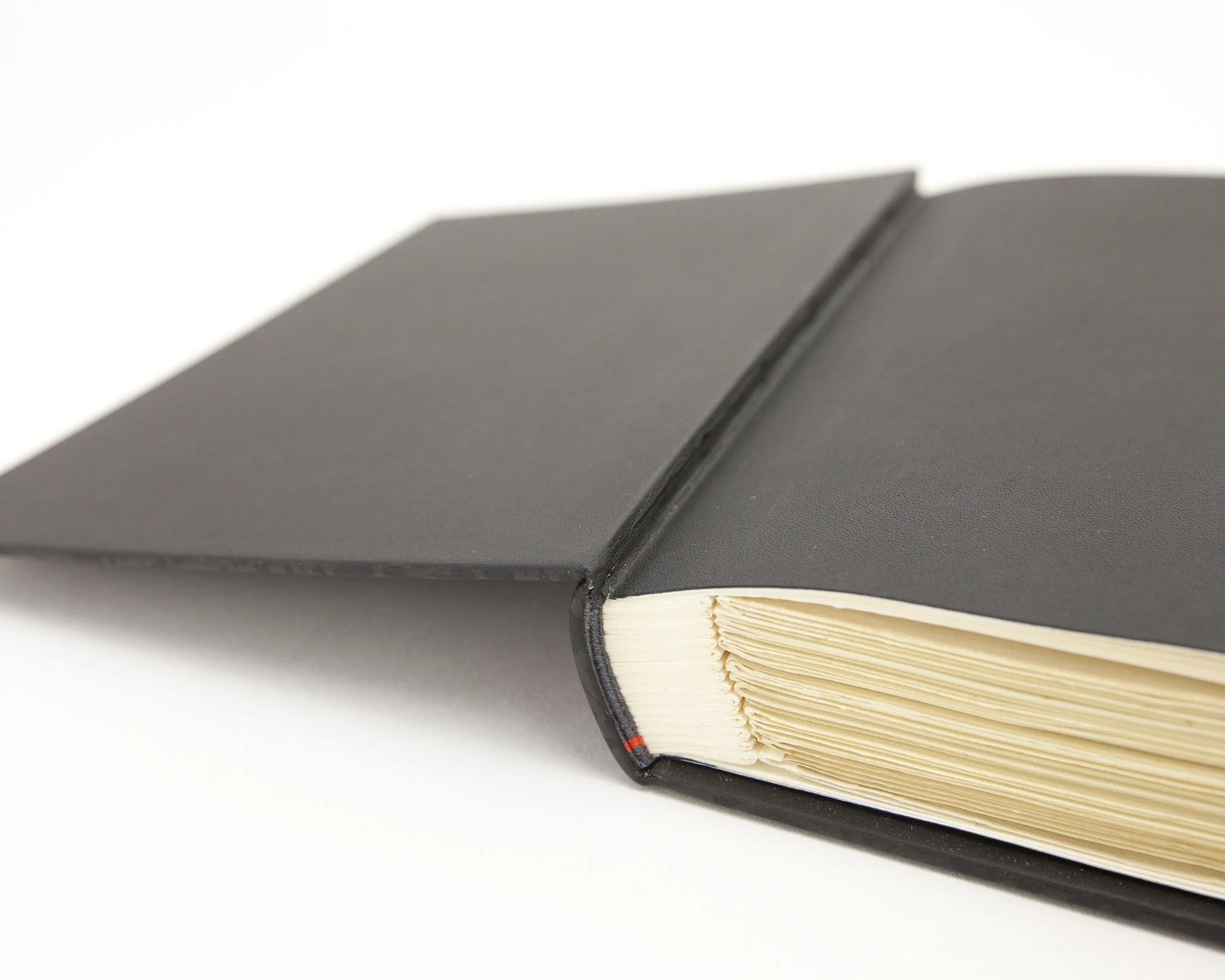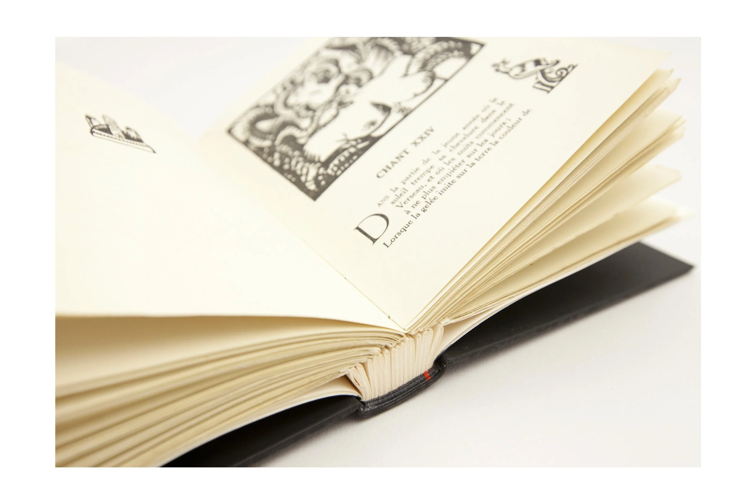 Réalisée en 2014 dans le cadre de mon projet de diplôme. Reliure classique cinq ficelles en plein cuir noir mat sérgraphié, avec gardes bords à bords et volantes en cuir noir mat, montage sur onglet, tranchefile main, pièces de cuir rouge dorée au film noir. Première pièce de mon tryptique sur le thème de l’enfer.