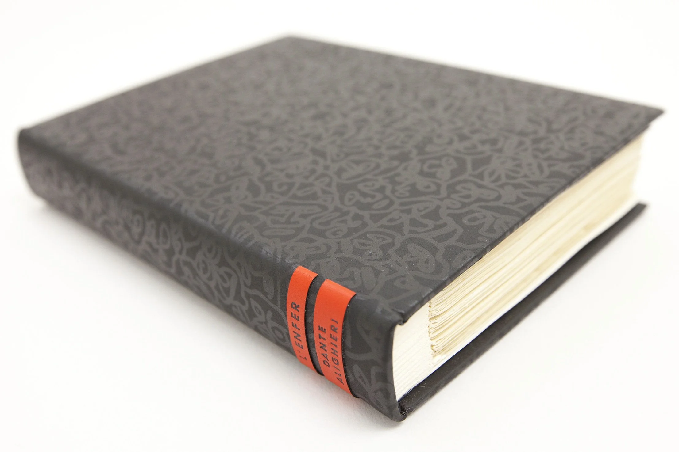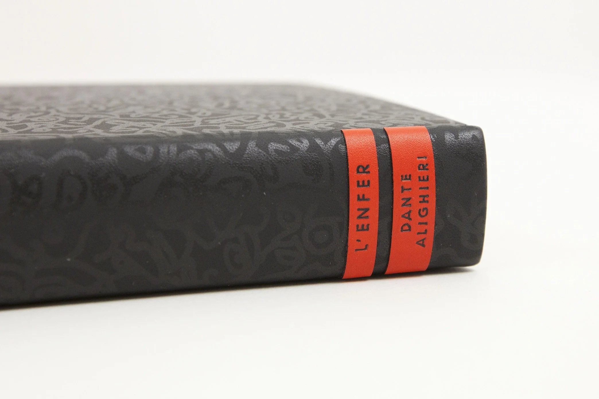 Figure incontournable de la littérature sur le thème, cette reliure est traitée de manière classique et se veut l'exploration des codes traditionnels de l'imagerie infernale. Ainsi cette reliure sombre aux touches écarlates est ornée de multiples visages dessinés de manière grotesque, comme un fourmillement de gargouilles et autres figures malicieuses. Ce procédé de trame permet de jouer sur une sensation d'étouffement liée à la multiplicité et à l'accumulation.