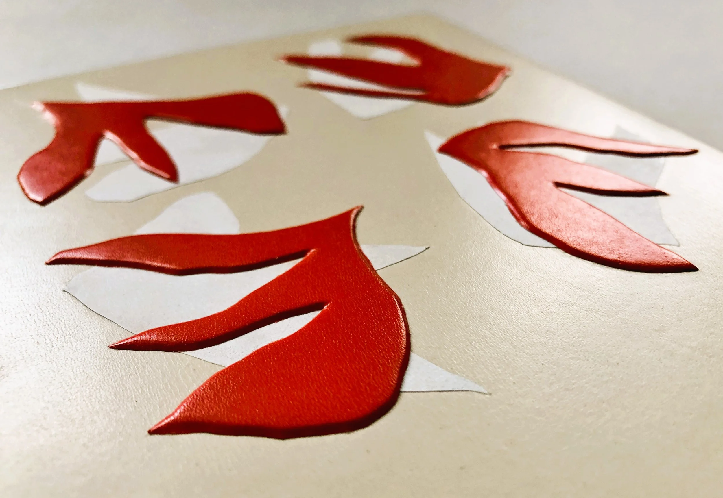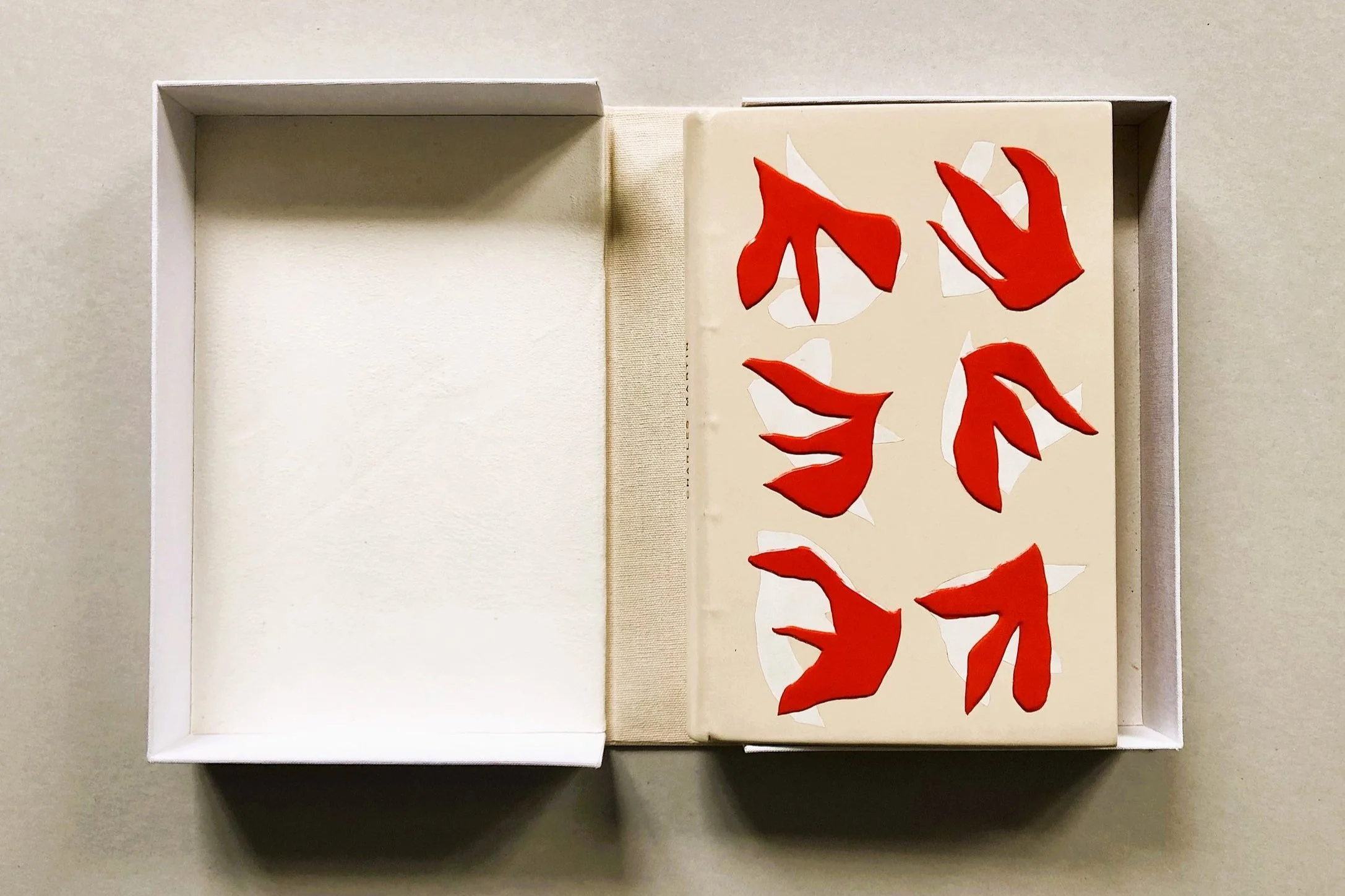 Le visuel, d’abord conçu comme un ensemble de fleurs fanées, a vu ses formes se transformer peu à peu pour gagner en agressivité (elles sont dans mon imaginaire des serres acérées). Rouge sur blanc, pièce bombées sur pièces incrustées, qu’on ne s’y trompe pas: sous le vernis, il est bien question de violence dans ce livre. De violence, de domination et d’emprise.