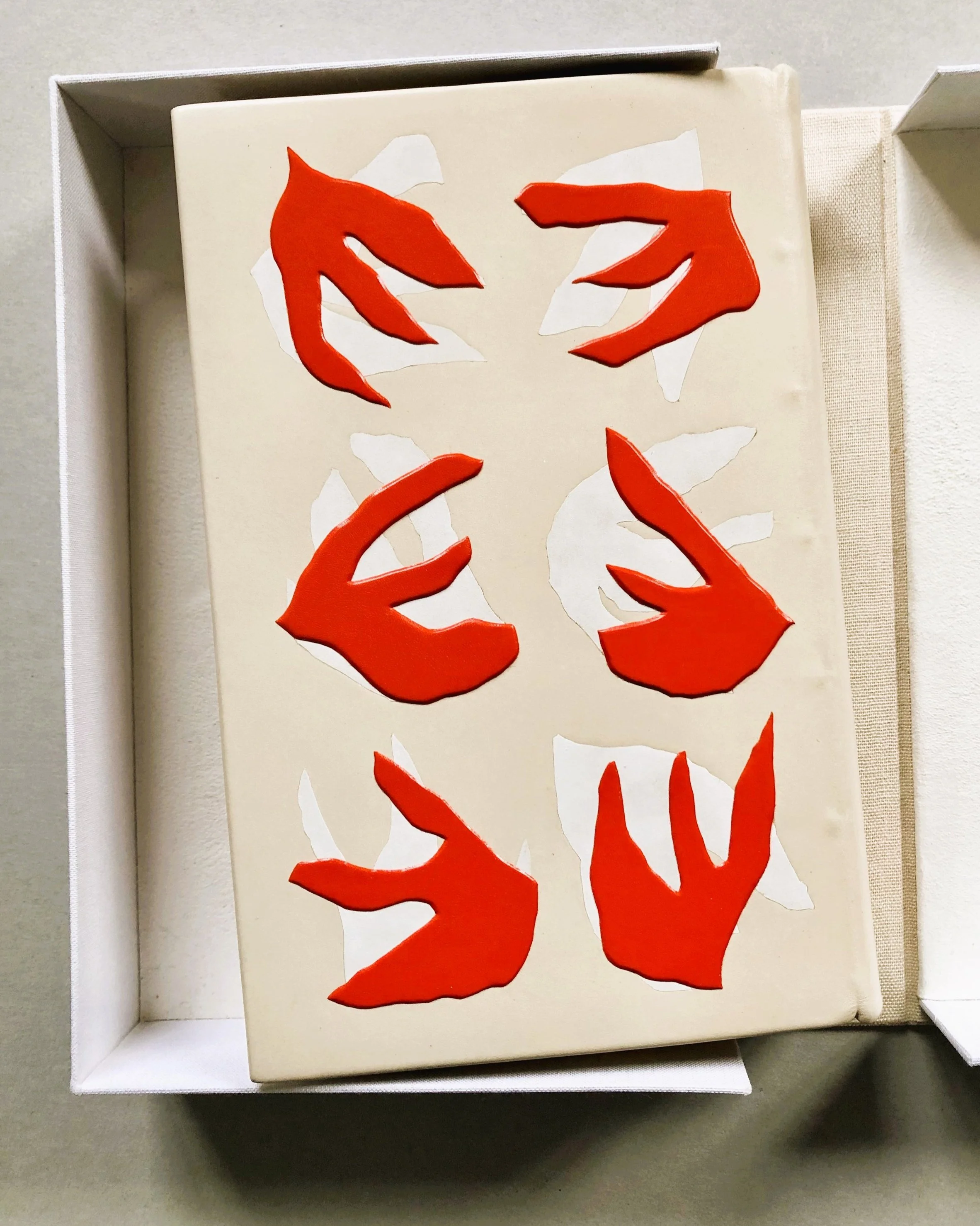 Réalisée en 2022, pleine reliure gardes bords à bords et volantes en daim, tranchefile chapiteau, avec décor en pièces incrustées et pièces bombées. Dorure réalisée par Geneviève Quarré de Boiry.