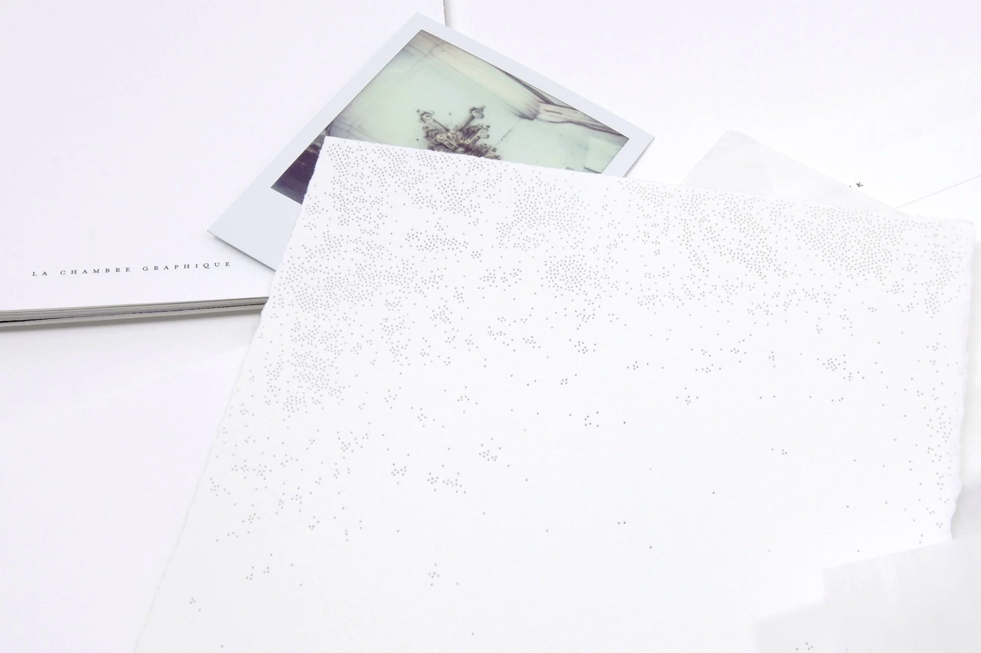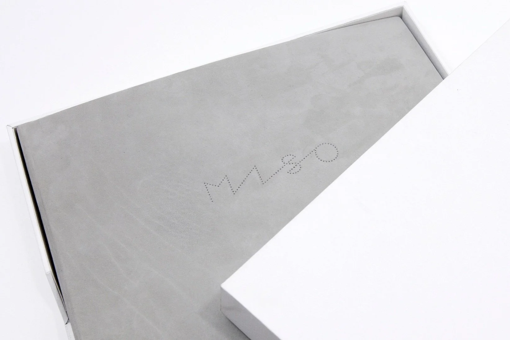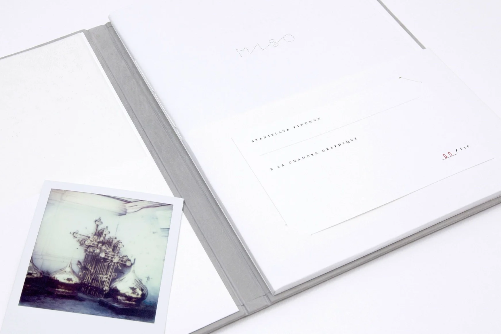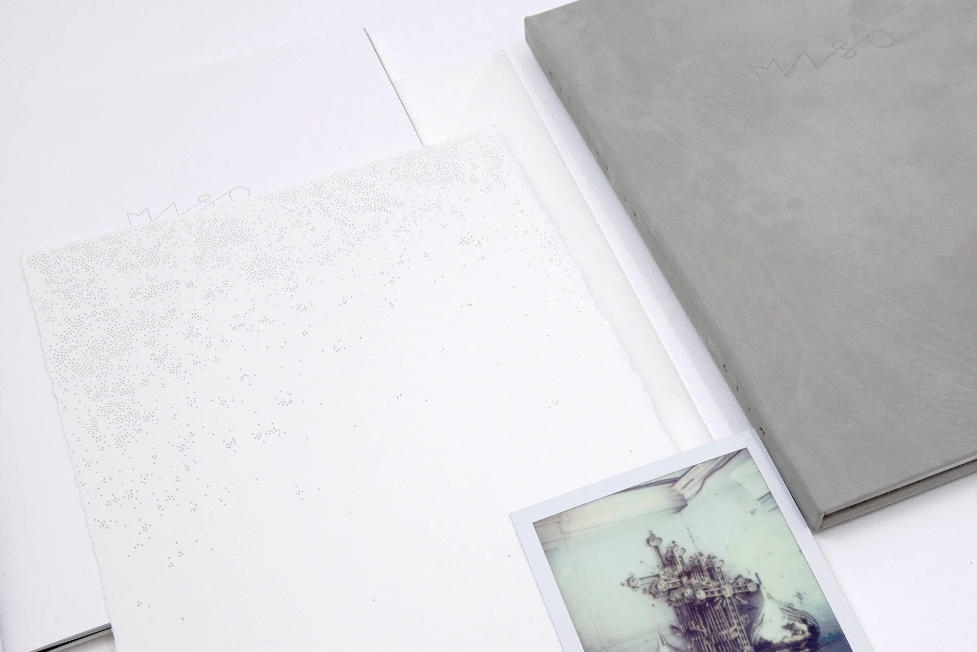 Façonnage sur mesure d'une série de fanzine avec quelques exemplaires de tête, agrémentés d'un original de l'artiste, d'un polaroïd et d'un coffret en agneau nubucké. La couverture porte le logotype de l'artiste poussé à froid au poinçon. Réalisé en 2014