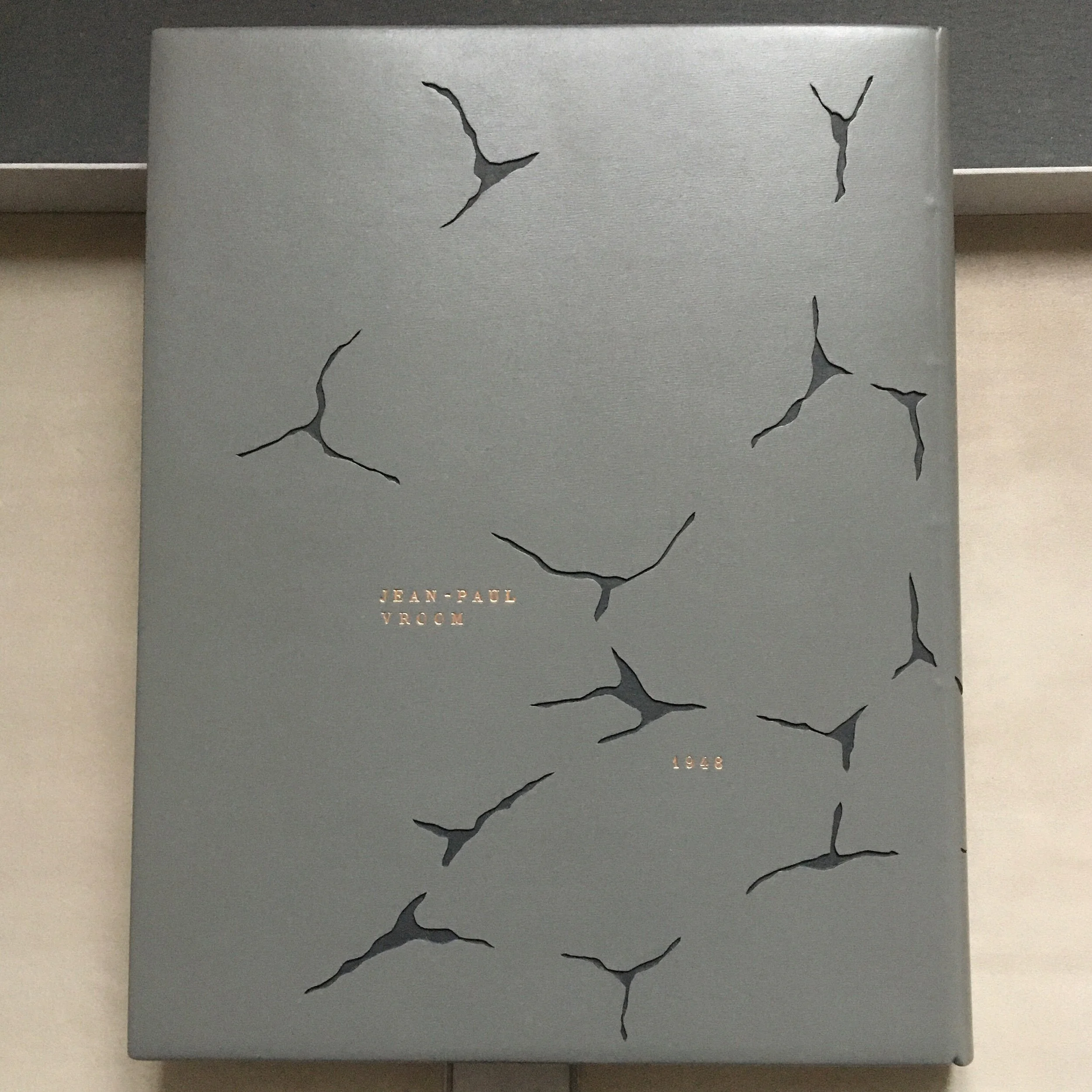 Réalisée en 2020, pleine reliure grise aux gardes bords à bords, volante en croute de cuir d’aspect moellon, tranchefile chapiteau, décorée de pièces en relief et d’incisions dans le cuir. Auteur et date de publication poussés à l’oeser cuivré.