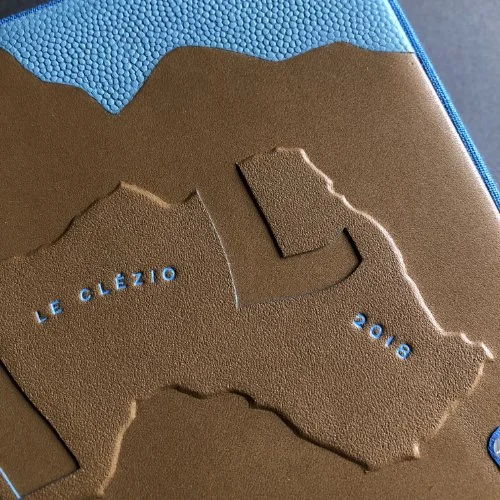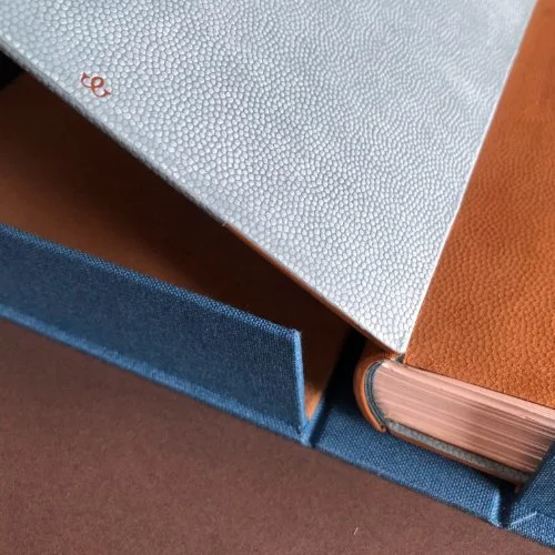 La couvrure est réalisée en plusieurs fois, couleur par couleur. Le livre a d’abord été couvert de peau marron prédécoupée, puis les éléments en peau bleue à grain caviar ont été découpés depuis le tracé existant sur le livre avant d’être collés sur la reliure. Les gardes dites “bords à bords”, sont réalisées en cuir bleu à grain caviar. Elles rejoignent le bord des plats et couvrent les mors intégralement en rejoignant les tranchefiles. La garde volante est en chèvre velours de teinte proche de la peau de couvrure. Le contact du contreplat au grain caviar et de la garde volante trace une empreinte sur la peau velours.