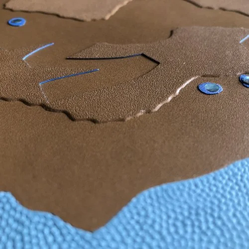 Les mosaïques, à bords tantôt bombés, tantôt coupées franches, sont des formes libres dans laquelle sont coupées en partie les lettres composant le titre. Il est coupé franc, lettre à lettre, mais il est seulement à demi lisible, effacé, et déformé. J’ai modifié les caractères typographiques (le Faune d’Alice Savoie) sur logiciel de dessin avant de les imprimer, les décalquer et les couper dans mes pièces de cuir. Dans une tentative non-dissimulée d’être dans la topographie (celle de l’ile ou celles des mornes, au choix), j’ai apporté un soin particulier à ce travail de mosaïque: dans les formes libres bombées sont coupées nettes les lettres, de manière à recomposer le paysage brutalement et artificiellement. Pour apporter une seconde dimension à cette intervention, j’ai imaginé les caractères typographiques tordus, comme déformés au fond de l’eau d’une piscine, noyés.