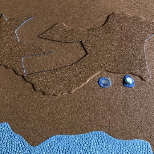 Dans cette lutte j’ai aussi incrusté des trésors, petites pastilles de nacre entourées de cuir pailleté, car ce sont bien les ressources qui sont à l’origine de toute cette misère. Perverse, la nacre se permet d’ailleurs de transformer toutes les lectures, en apportant de la lumière dans l’obscurité autant qu’en s’effaçant en pleine lumière.